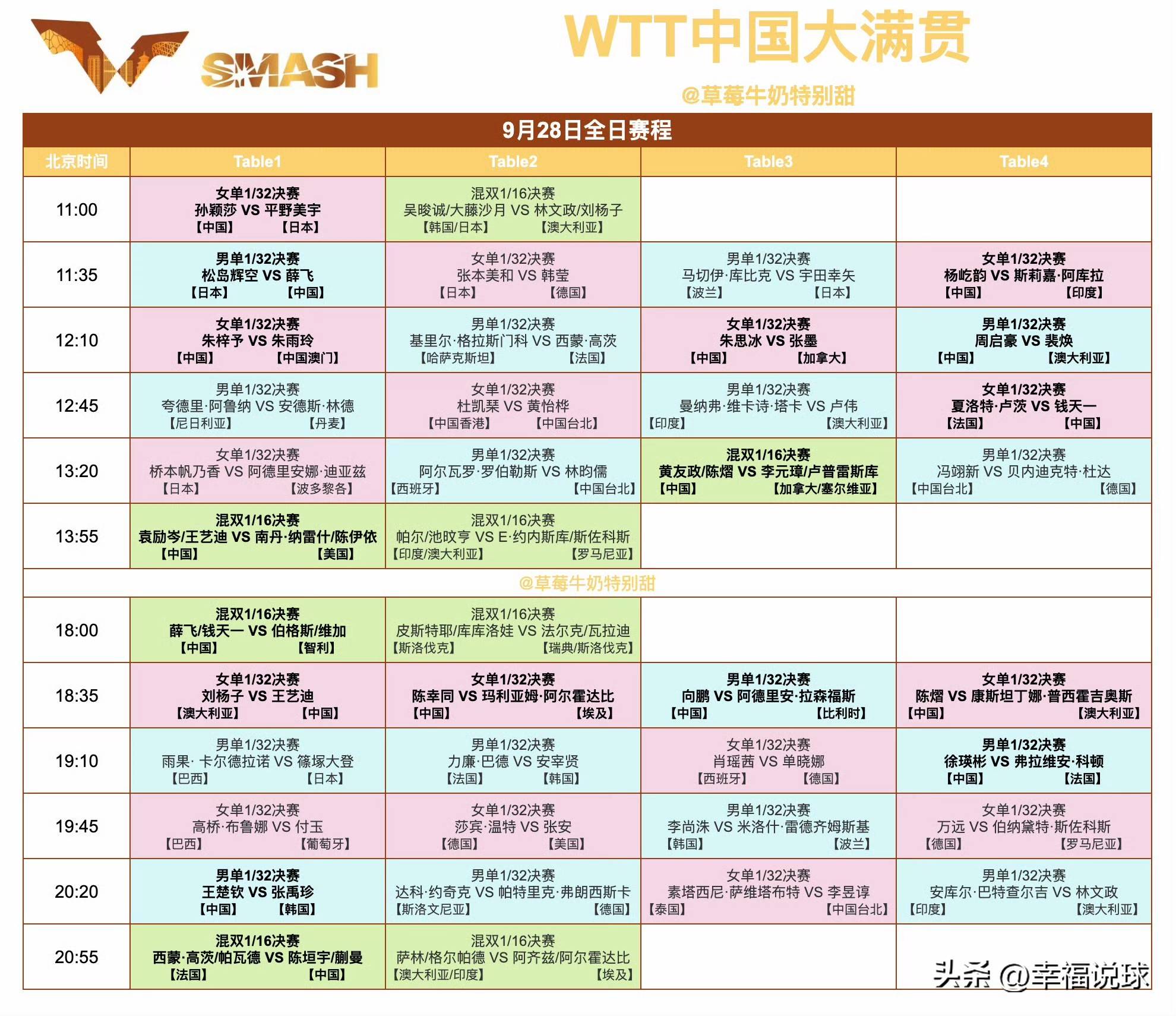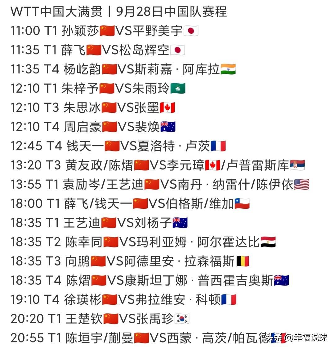 9月28日,国乒全天17场外战,其中4场混双;13场单打,孙颖莎打头阵、对战日乒世界杯冠军平野美宇,王楚钦压轴、再战韩乒一哥张禹珍。具体赛程如下: