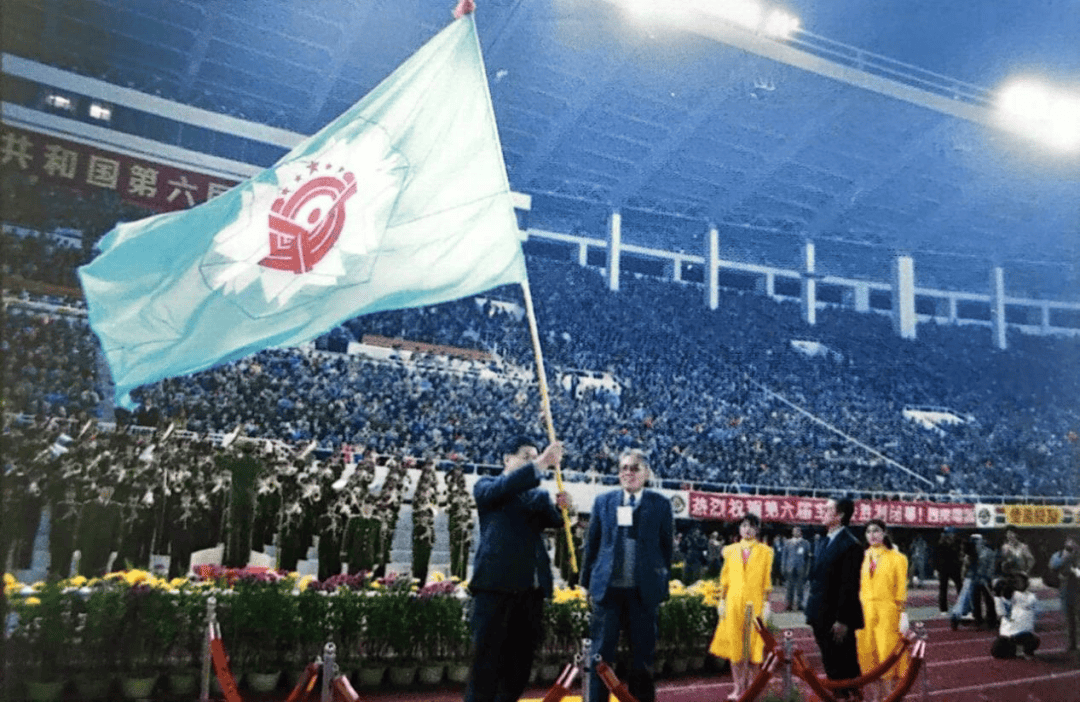 六运会闭幕式上进行会旗交接(来源:《中国十运:1—10届全运会精彩回眸》)