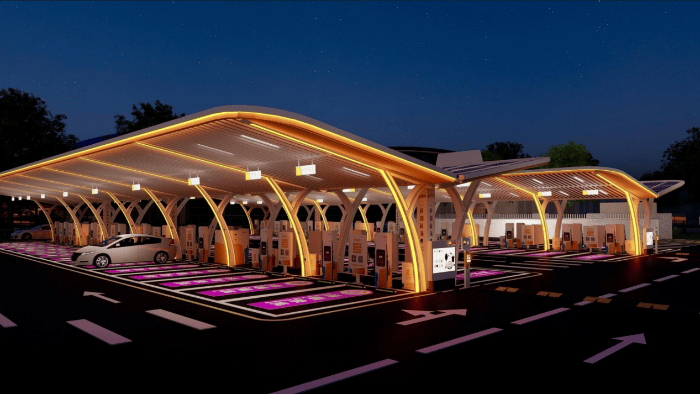 在宝安区体育中心游泳馆南侧的停车场,由昆仑网电投资、英飞源提供技术支撑的光储超充站格外引人注目。该站采用领先的全液冷超充技术,具备高防护、高可靠和低噪声(运行噪声低于60dB)的突出特点,完美契合体育馆等对环境要求高的公共场景。