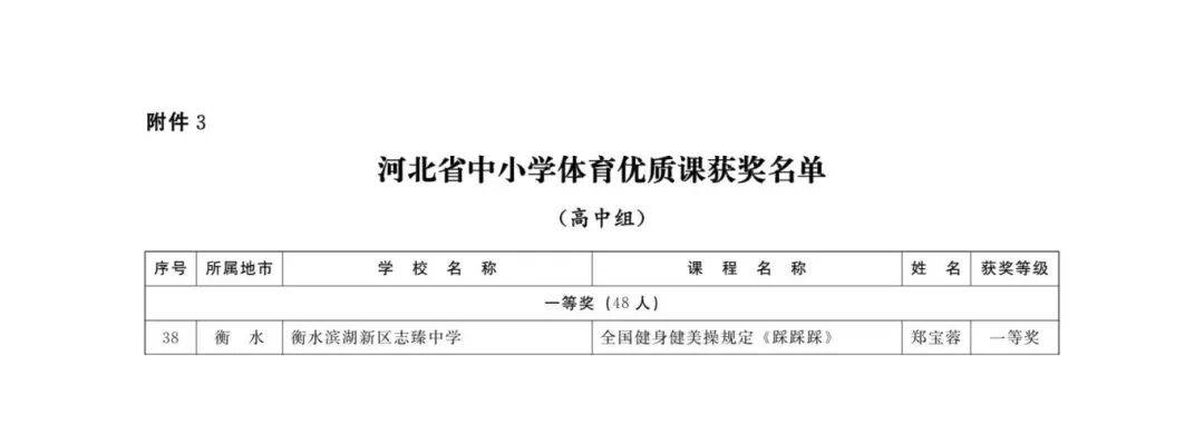 根据评选结果通知附件名单显示,在高中组获奖名单中,我校郑宝蓉老师位列其中(序号38),其课程 《全国健身健美操规定〈踩踩踩〉》 被评定为一等奖。这标志着郑宝蓉老师的课堂教学设计、组织实施、育人成效以及对新时代体育教学要求的理解与实践,得到了省级专家评委的一致认可。