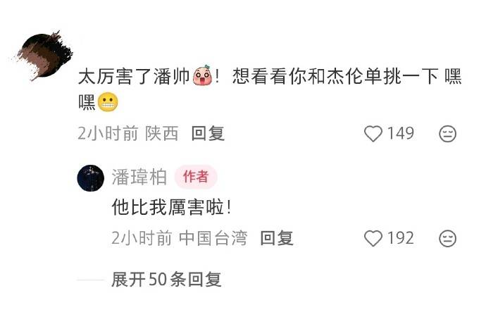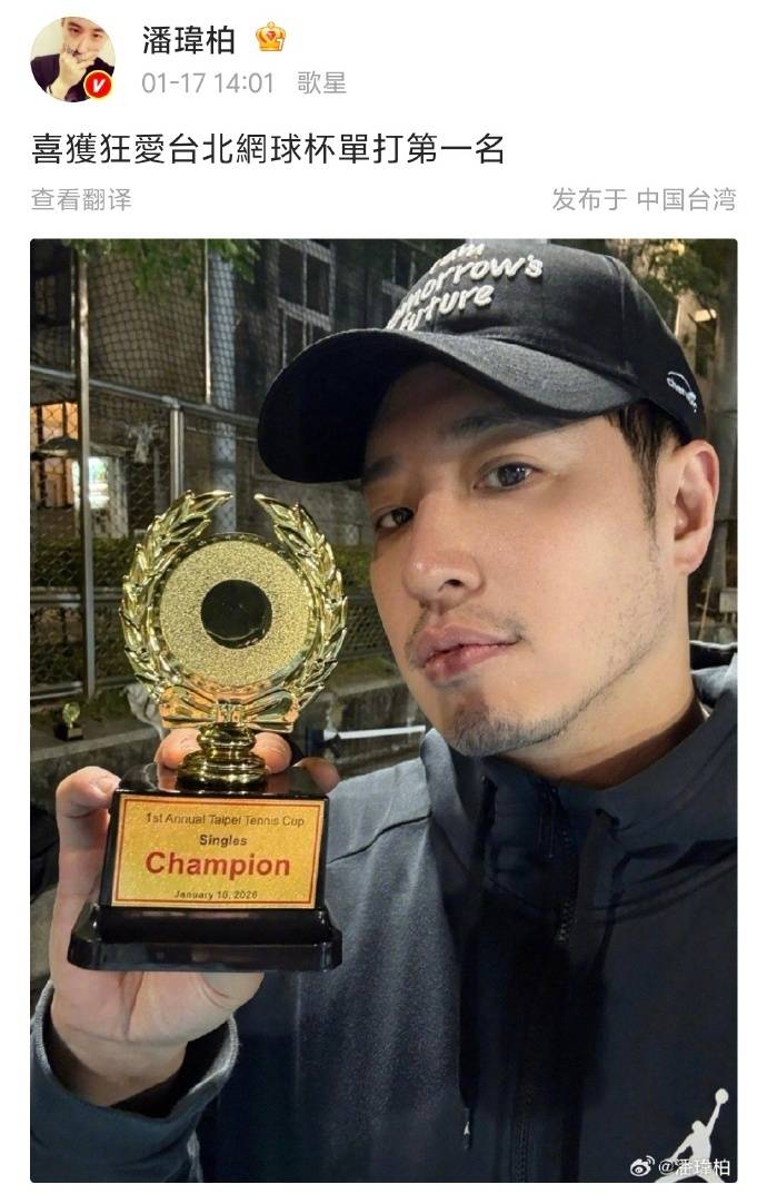 1月17日,据中新文娱,潘玮柏晒出一张奖杯照,说自己运气不错,“喜获狂爱台北网球杯单打第一”!有网友留言:“太厉害了潘帅!想看你和杰伦单挑一下嘿嘿”,潘玮柏说:“他比我厉害啦!”