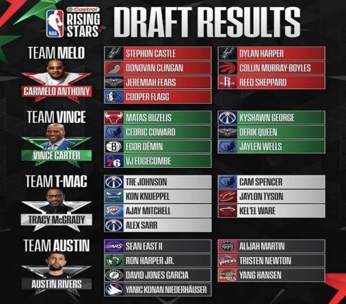 里弗斯队的半决赛对手是卡梅隆·安东尼执教的球队,这支队伍堪称本届赛事的最大夺冠热门。阵中拥有2025年状元秀库珀·弗拉格,这位达拉斯独行侠新星本赛季场均贡献20.4分、6.6个篮板和4.1次助攻;多诺万·克林根作为杨瀚森的队友,本赛季已经成为球队的首发中锋,这位二年级中锋本赛季场均贡献11.4分11.4篮板的两双数据,排名联盟篮板榜第三。此外,去年最佳新秀得主斯蒂芬·卡斯尔也在这支队伍中,本赛季他在马刺场均贡献16.5分、7次助攻和5个篮板,展现了全面的组织能力。