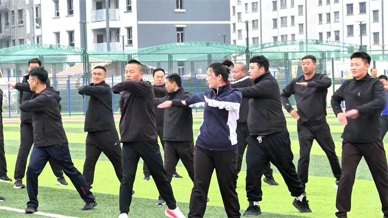 比赛现场气氛热烈,竞技亮点频出。在篮球技能环节,教师们完成后转身运球、体前变向换手运球等高难度动作,持球穿梭于障碍柱间,动作流畅,控制精准。足球项目中,绕杆带球、弧线射门等环节充分展现出参赛教师扎实的基本功。广播操《七彩阳光》《舞动青春》和武术操《英雄少年》的集体展示,则体现出体育教师队伍的整齐划一与刚健风貌,赢得现场阵阵掌声。