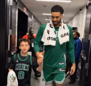 赛后,NBA官方社媒晒出:今日比赛结束后,塔图姆牵着儿子Deuce的手离开球场的有爱瞬间。
