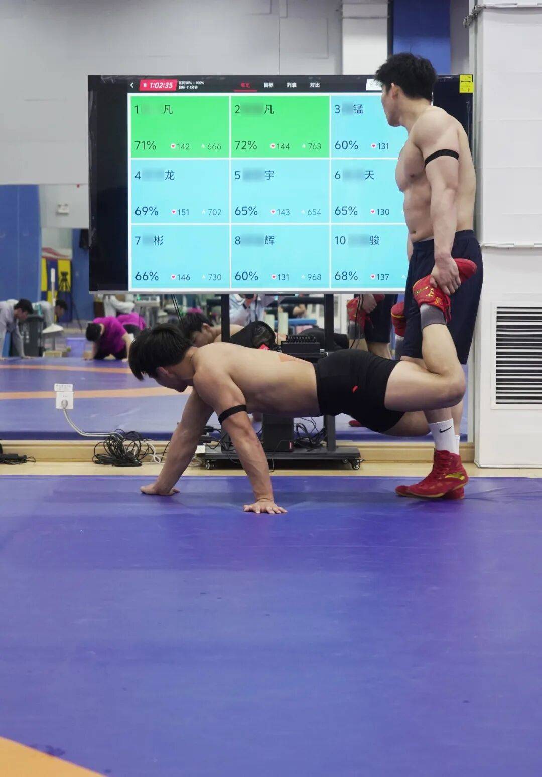 随着时代发展,在如今的训练场上,科技的力量正深刻重塑着冬训的每一个环节。在浙江体育职业技术学院重竞技训练馆内,摔跤队队员们佩戴心率带,整装待发,开启当日的训练。这枚小小的心率带,已成为教练组掌握队员状态的“得力助手”。