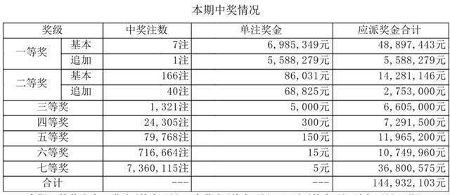 本期一等奖出自:北京(基本1注)、内蒙古(基本1注)、辽宁(基本1注追加1注)、浙江(基本3注)、山东(基本1注),单注奖金最高1257万元。