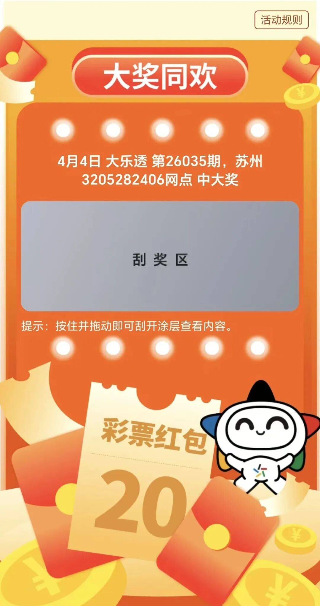 当苏州体彩开出超100万元奖金大奖时,“大奖同欢”活动启动,用户打开 “公益值乐园” 小程序,在首页或活动专区找到并点击“大奖同欢” 入口,进入活动页面,刮开“刮奖区”参与活动。