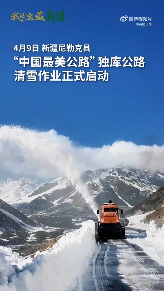 据兵团日报,4月9日,新库公路清雪作业正式启动。独库公路积雪最深处达2米,铲雪机、除雪车等同时上阵,轮番作业。独库公路地处天山中段,历年6月中旬至10月初通行。网友:独库公路要换下雪白皮肤了。