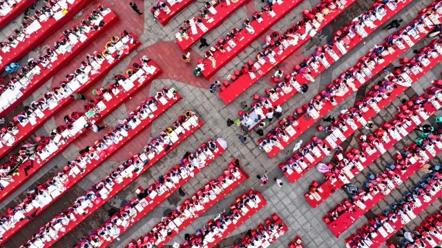 △4月11日,“至成杯” 三穗县第四届千名青少年现场书画大赛在贵州省黔东南苗族侗族自治州三穗县将军广场举办,一千余名学生参赛。(来源:光明网、视觉中国)