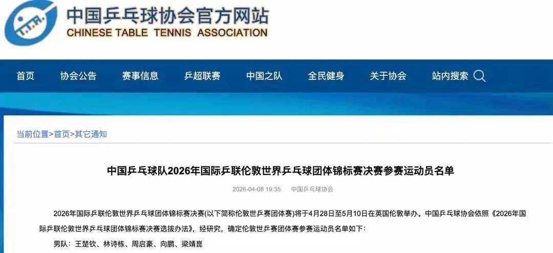 4月8日,中国乒协官方公布2026年伦敦世界乒乓球团体锦标赛最终参赛名单,这是国乒本月最重要的动态信息,备受国内外球迷关注。伦敦世乒赛团体赛将于4月28日至5月10日举行,分为小组赛与淘汰赛两个阶段,小组赛在铜箱体育馆进行,淘汰赛在温布利体育馆进行。男队参赛五人为王楚钦、林诗栋、周启豪、向鹏、梁靖昆,女队五人为孙颖莎、王艺迪、陈梦、王曼昱、钱天一,这份名单兼顾主力稳定性与新人成长性,既保留了东京奥运与德班世乒赛的核心班底,也加入了近期表现突出的年轻选手,体现出国乒新老交替的平稳过渡。樊振东因个人调整原因主动退出本次世乒赛,梁靖昆凭借近期稳定表现获得参赛资格,周启豪则以队内选拔赛冠军身份入选,男队阵容攻防均衡,抗压能力与单打实力均处于世界顶尖水平。