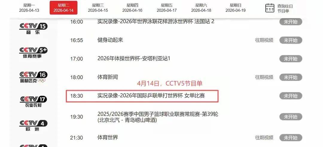 2026-04-16体育,足球,波胆,反波胆,角球,串关,大小球,世界杯,欧洲杯,比分,足球比分,赛事,足球赛事,电竞赛事,体育赛事直播,足球直播平台,世界杯直播,足球直播,体育直播,NBA直播,游戏直播,LOL直播北京时间2026年4月14日,广大乒乓球爱好者迎来观赛好消息,中央广播电视总台央视体育频道CCTV5在本日安排乒乓球赛事转播,重点聚焦国乒近期重磅赛事精华,为球迷带来高质量的乒乓视觉盛宴。本次转播以2026年国际乒联单打世界杯精彩赛事为核心,完整呈现国乒主力在顶级赛场的巅峰表现,同时兼顾赛事复盘与战术解析,让观众在清晰的赛程安排下不错过任何精彩瞬间。结合央视官方发布的最新节目单,4月14日CCTV5乒乓球转播时段明确、内容充实,覆盖女单经典对局与关键场次精华,既满足老球迷重温高光时刻的需求,也为关注国乒动态的观众提供全面信息。与此同时,国乒全队正处于伦敦世乒赛赛前冲刺阶段,主力阵容休整备战、年轻选手总结经验,整体动态备受关注,本文将完整呈现4月14日CCTV5乒乓球转播时间表,并全面梳理国乒最新备战动态、赛事总结与人员情况,为球迷提供权威、详实、及时的资讯参考。